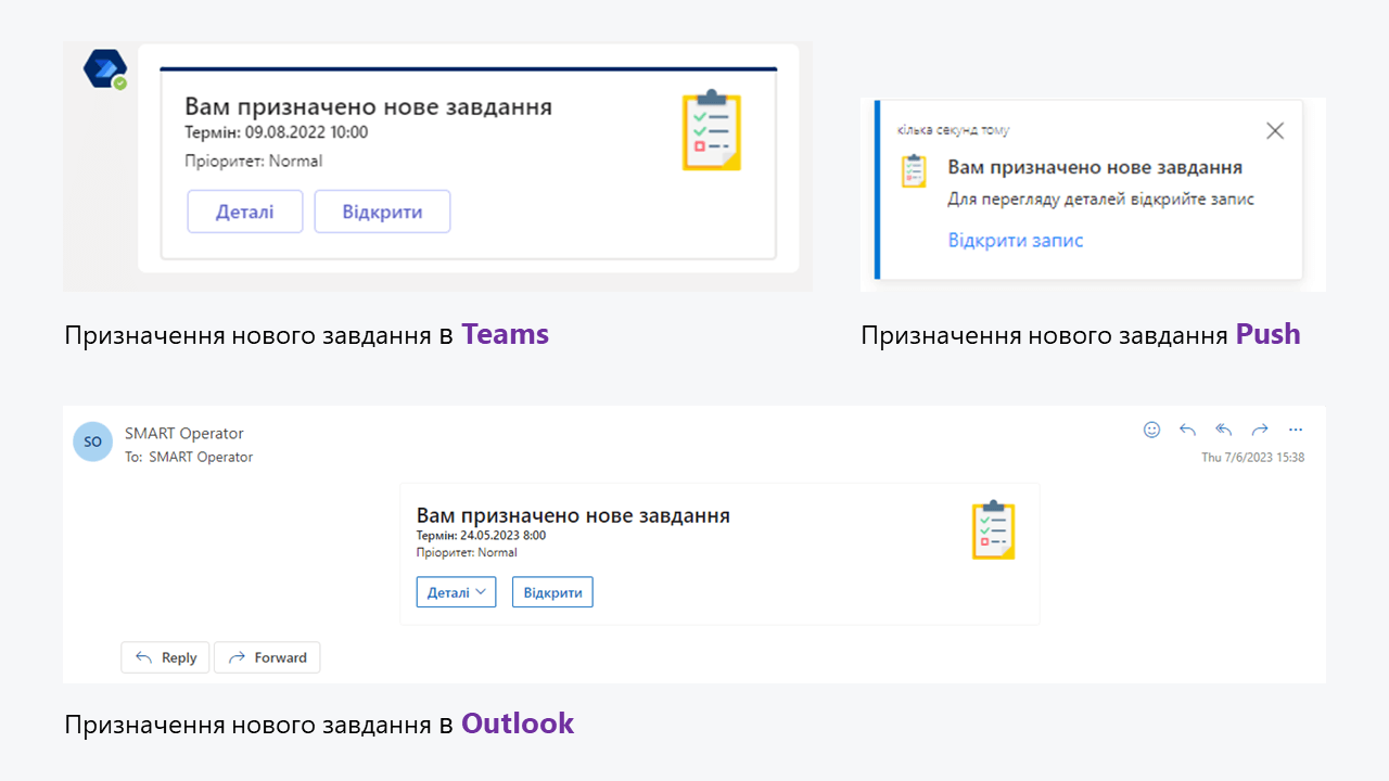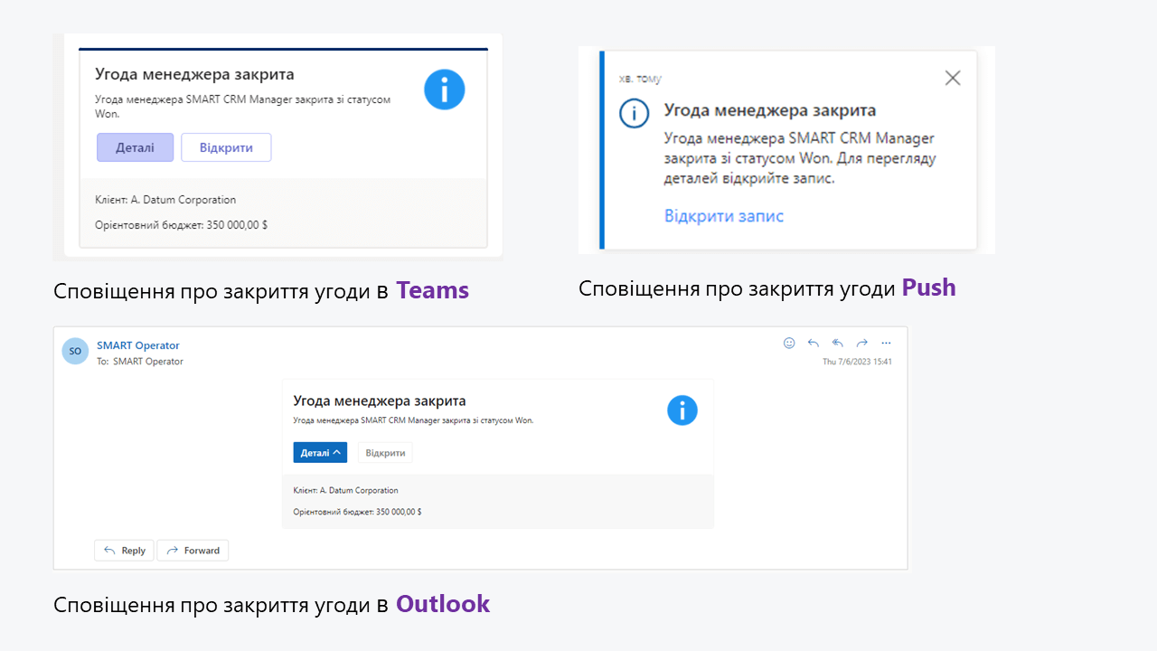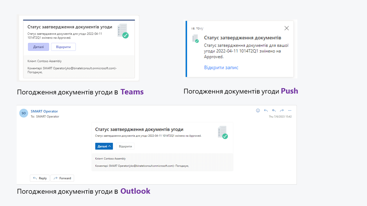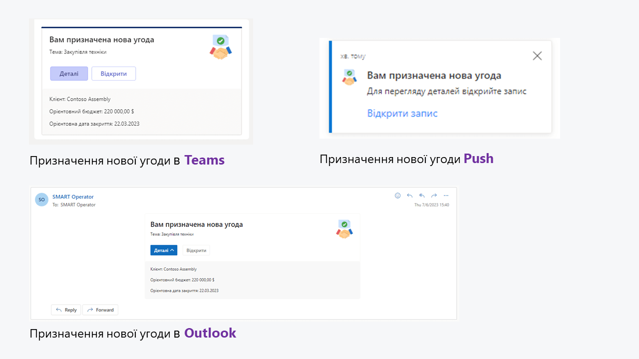 В оновленій функціональності рішення також доступні налаштування сповіщень в одному з обраних каналів: Teams, Outlook або Push-нотифікації всередині додатку. Користувачі SMART Sales зможуть отримувати сповіщення, щоб мати можливість відстежувати зміни у статусі угоди, процесі погодження супутньої документації щодо угоди або ж її призначенні чи закритті менеджером.