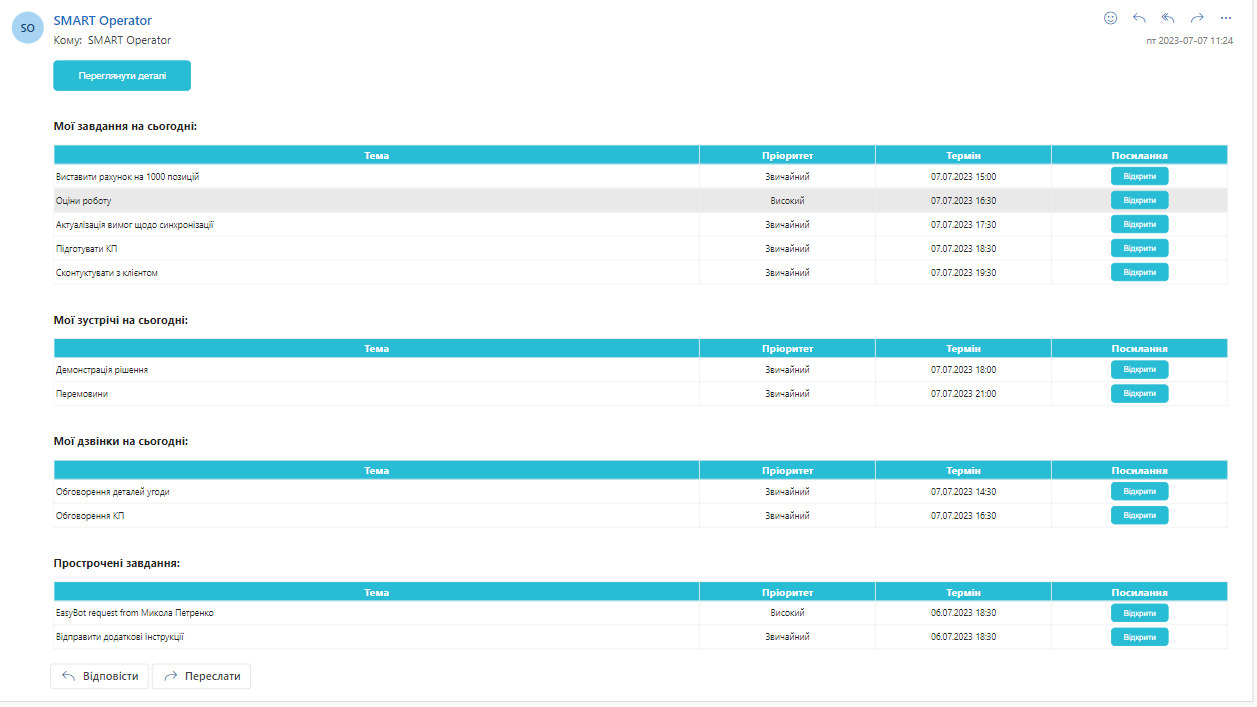 Функція передбачає можливість відправки щоденних звітів в Outlook для кожного користувача про заплановані на поточний день завдання, зустрічі, виклики, а також нагадує про прострочені або незавершені завдання. За необхідності, користувачі можуть зі звіту перейти до спеціальної приладної дошки для перегляду деталей.