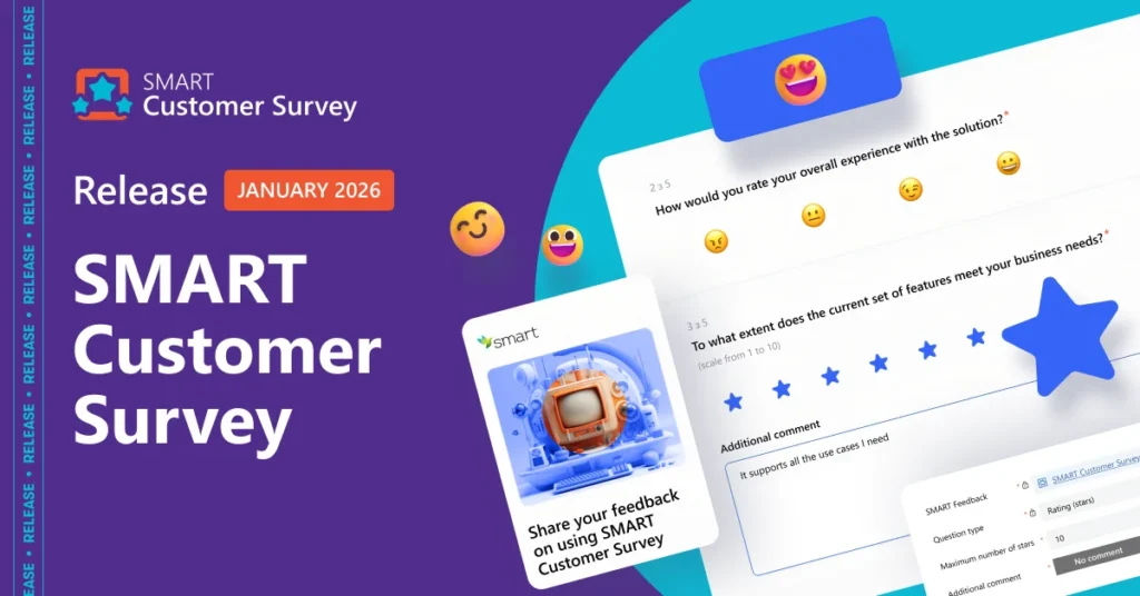 SMART Customer Survey is a new module in the SMART CRM product line that enables you to launch surveys fully tailored to your business processes — directly within your CRM system. The solution works both inside SMART CRM and with any applications built on the Power Platform (Power Apps / Microsoft Dynamics 365).