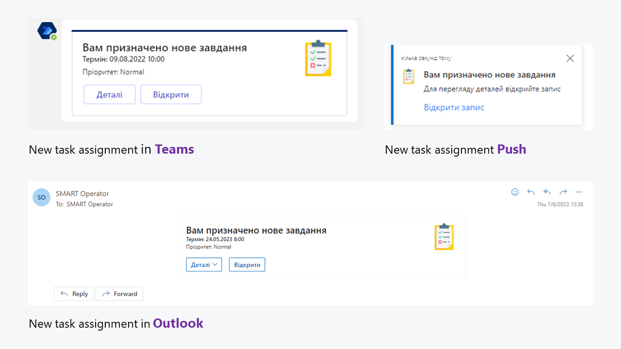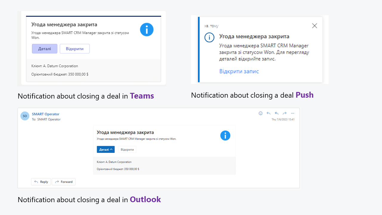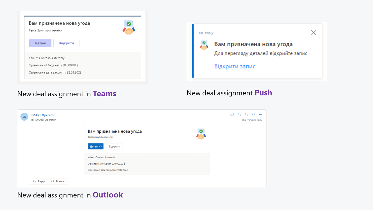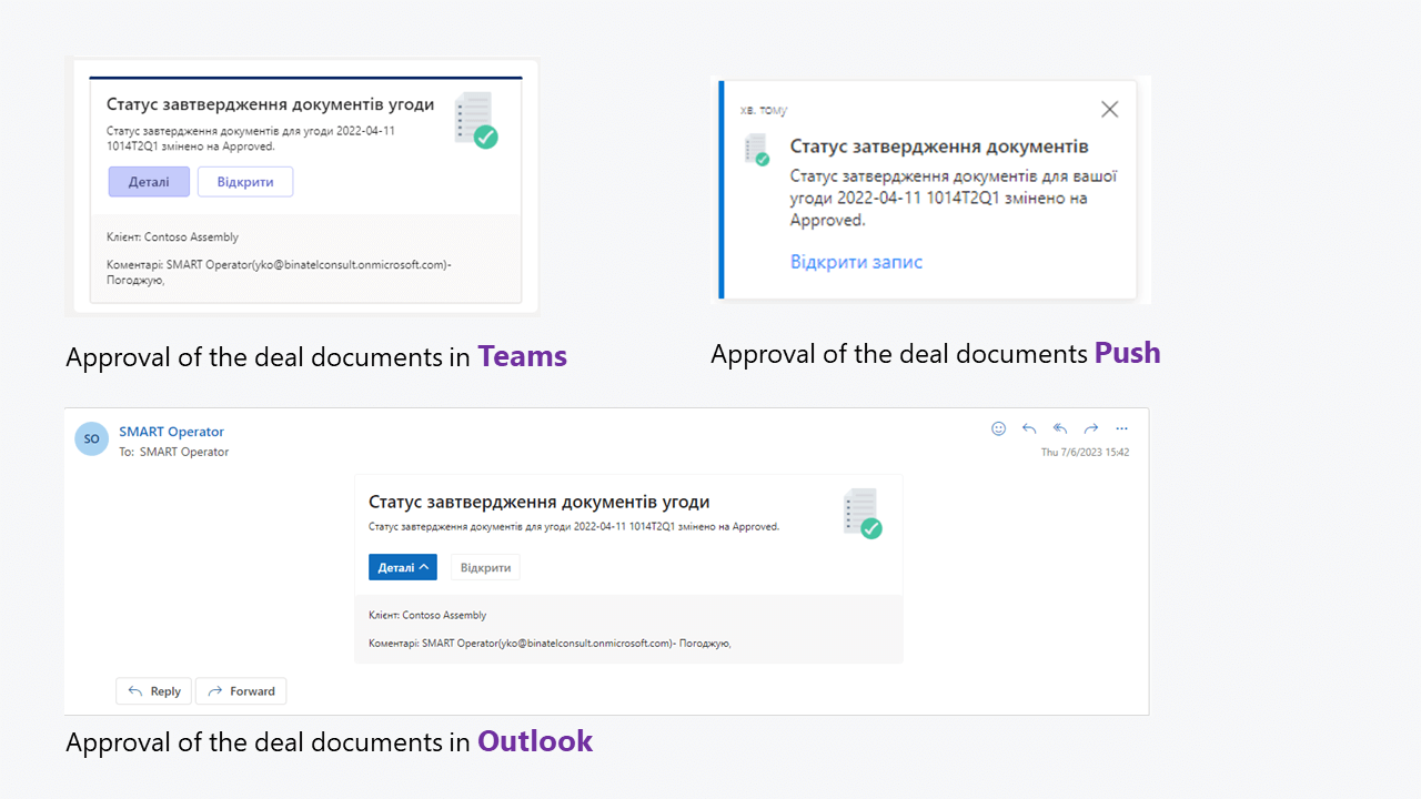 La funcionalidad actualizada de la solución también permite configurar las notificaciones en uno de los canales seleccionados: Teams, Outlook o notificaciones push dentro de la aplicación. Los usuarios de SMART Sales podrán recibir notificaciones para realizar un seguimiento de los cambios en el estado de una operación, del proceso de aprobación de la documentación conexa a una operación, o de su asignación o cierre por parte de un manager.