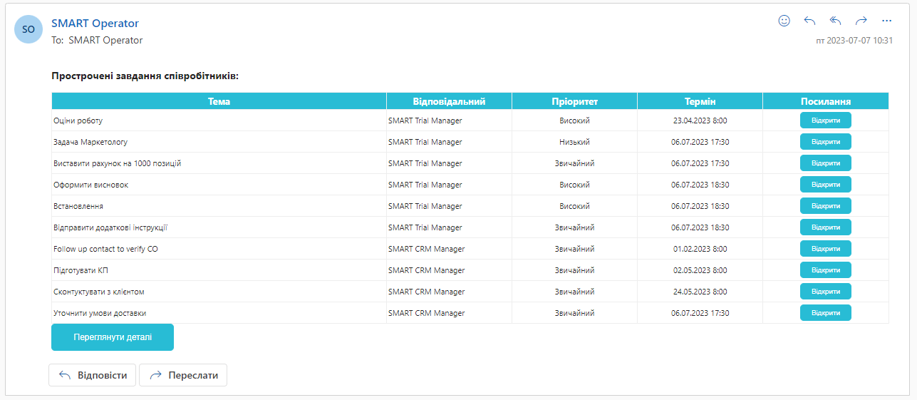 Raport dla kierownika działu jest teraz dostępny, aby ocenić stan rzeczy w dziale i obciążenie pracą każdego pracownika. SMART Sales będzie wysyłać codzienne raporty do Outlooka do menedżerów o zaległych zadaniach ich pracowników. W razie potrzeby menedżer może przejść z raportu do specjalnego pulpitu nawigacyjnego, aby wyświetlić szczegóły.