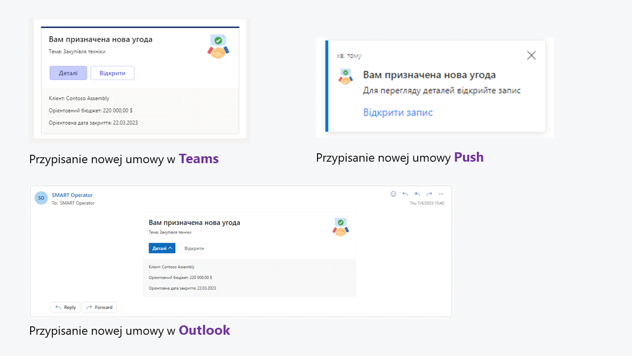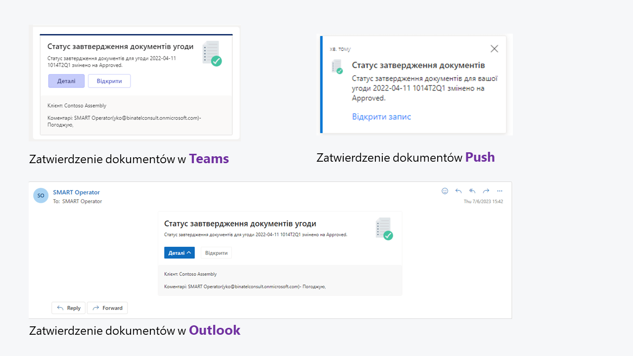 Zaktualizowana funkcjonalność rozwiązania obejmuje również ustawienia powiadomień w jednym z wybranych kanałów: Teams, Outlook lub powiadomienia push w aplikacji. Użytkownicy SMART Sales będą mogli otrzymywać powiadomienia w celu śledzenia zmian statusu transakcji, procesu zatwierdzania powiązanej dokumentacji dla transakcji lub jej przypisania lub zamknięcia przez menedżera.